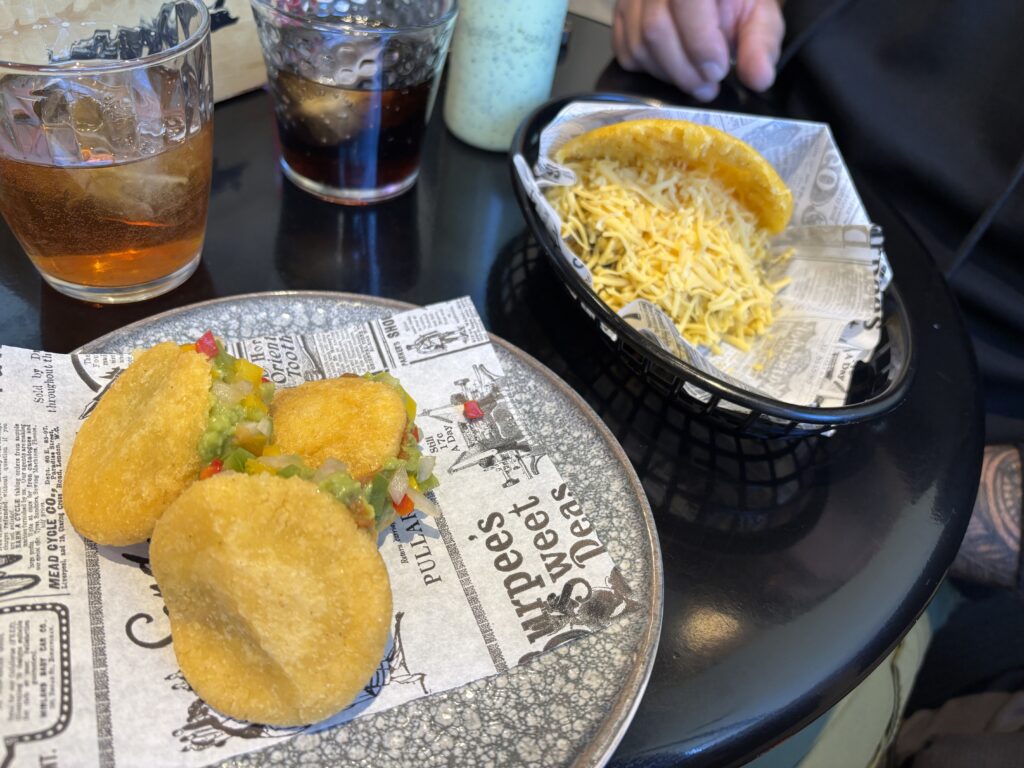 C’est exactement ce qu’il faut après un vol. Je prends des tortillas, lui une salade César et des frites. C’est très bon, le serveur est efficace et pour un prix correct.
