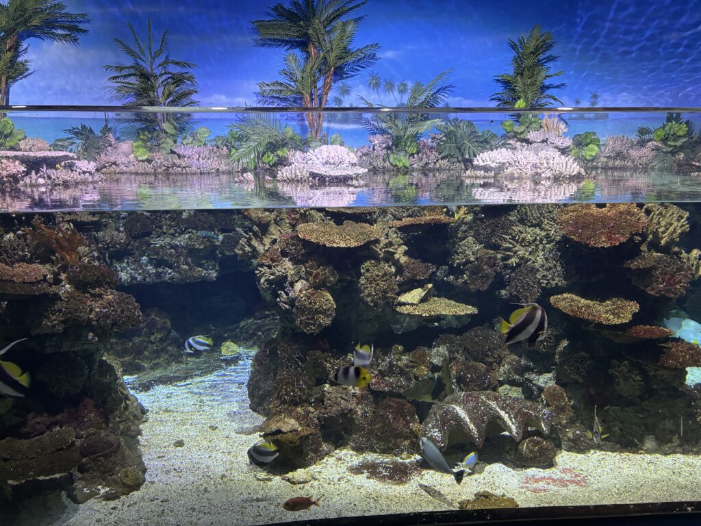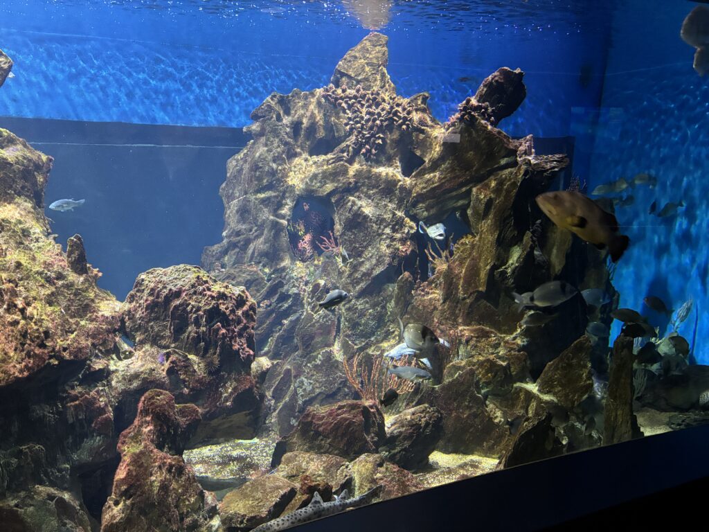 Il est bien agencé, avec de belles installations, des petits jeux ludiques pour les enfants (et comme nous sommes de grands enfants, nous les avons essayés bien sûr). Les aquariums sont variés et bien travaillés.