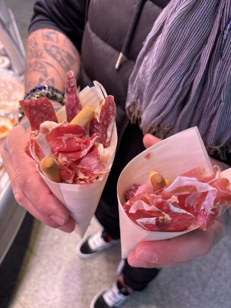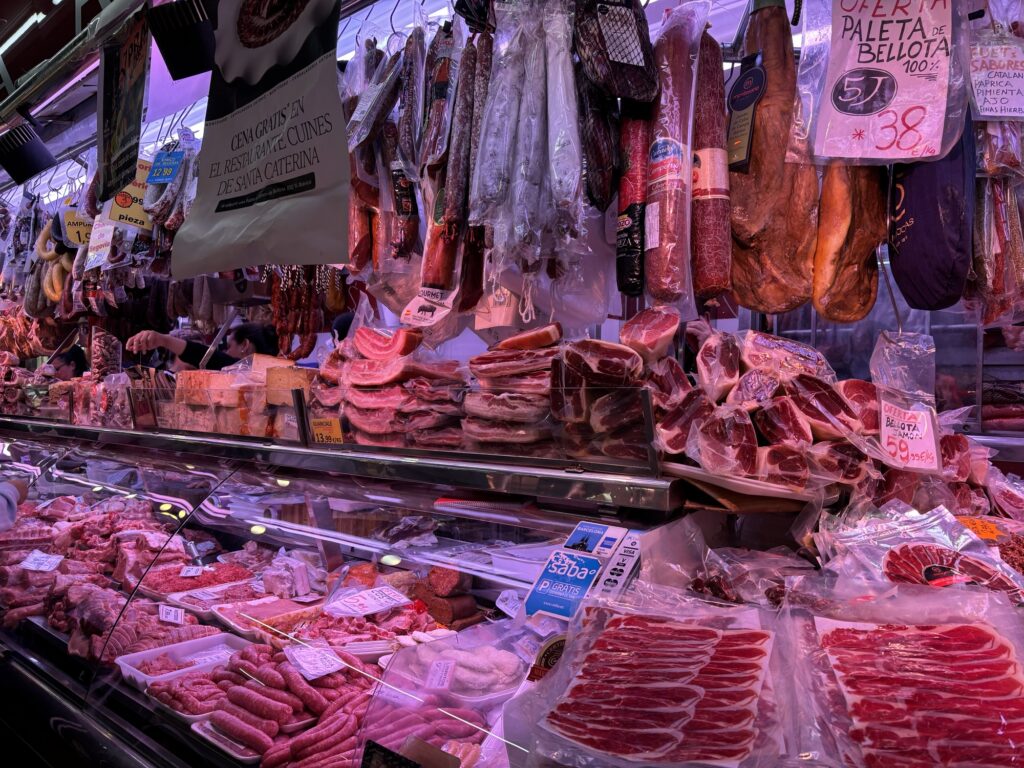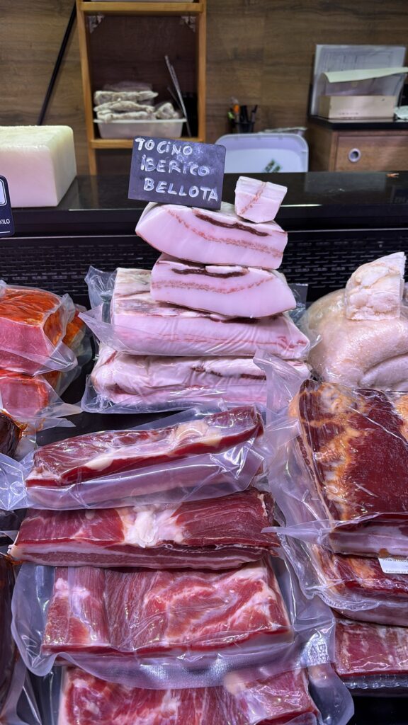 Nous arrivons enfin au marché. Un petit tour pour repérer les stands… Nous avons goûté au jambon ibérique, et la différence est flagrante. La qualité est exceptionnelle.
